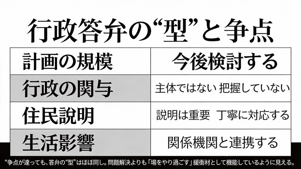 答弁は、問題を解決するためというより、場をやり過ごすための緩衝材として機能しているように見える。